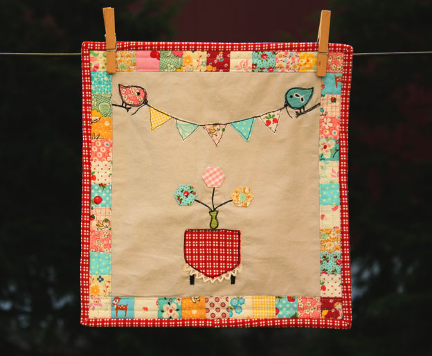 I can't stop with the birdies! I love this one. The colors, the size, everything. I pulled my American Jane fabrics out and used them in the patchwork border. I think they look great with the tree and birds. I love the vintage look of these prints.