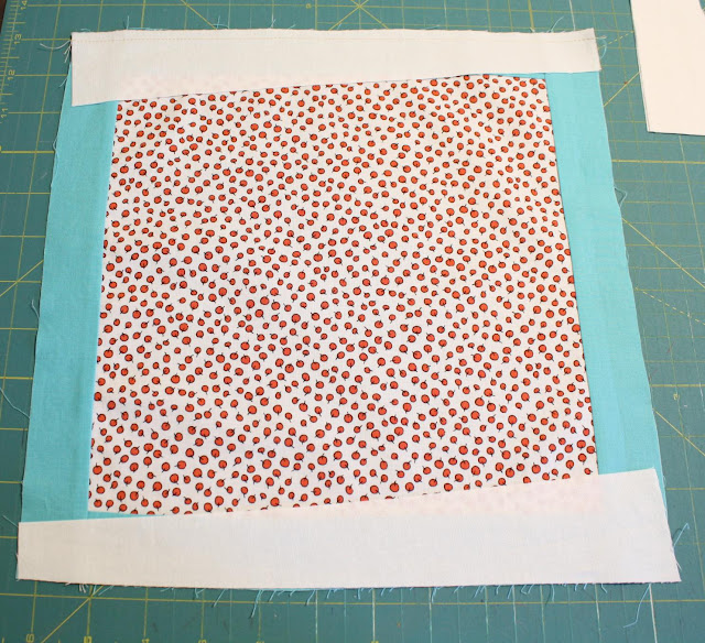 1.) Measure the top and bottom of the block that you are going to be putting the sashing around. For my blocks I added a 1 inch border (finished) to the layer cake piece and then measured that. (*note - I pre-wash my layer cakes, so that is why my measurements may not be the same as yours, etc...)
