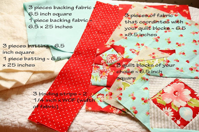 3 ~ 6.5 x 8.5 inch pieces of fabric that coordinate with your quilt blocks