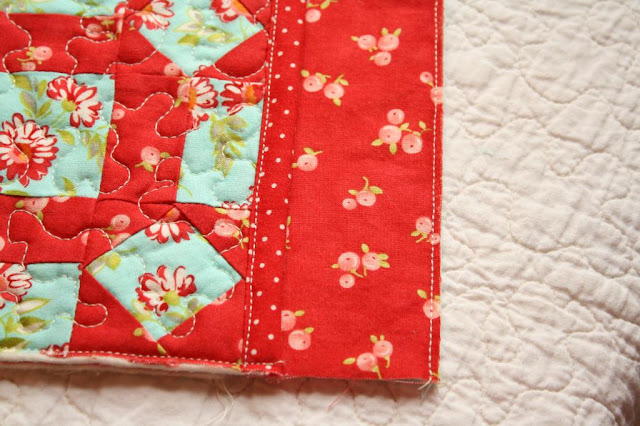 Now sew your binding and use some of it to bind the top of each block. I sew the binding to the back of the block and fold it over to the front.