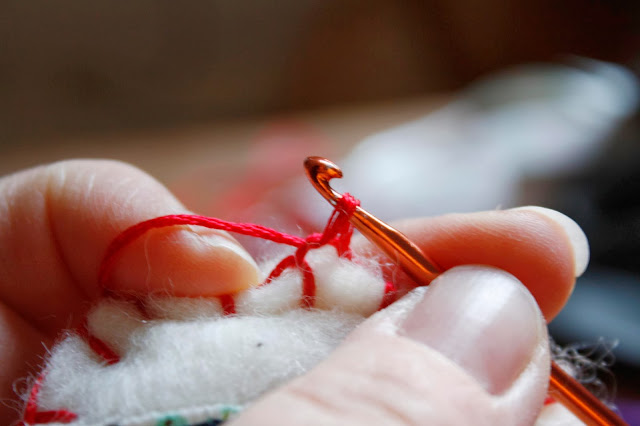 Double crochet 7 times into next blanket sitch.*note* If you have more than 20 blanket stitches, say 24 or 26, you can double crochet a lesser amount into the blanket stitches. I used 6 double crochets on my ornaments with 24 blanket stitches. They are less squished looking that way. Again, this is all just your preference.