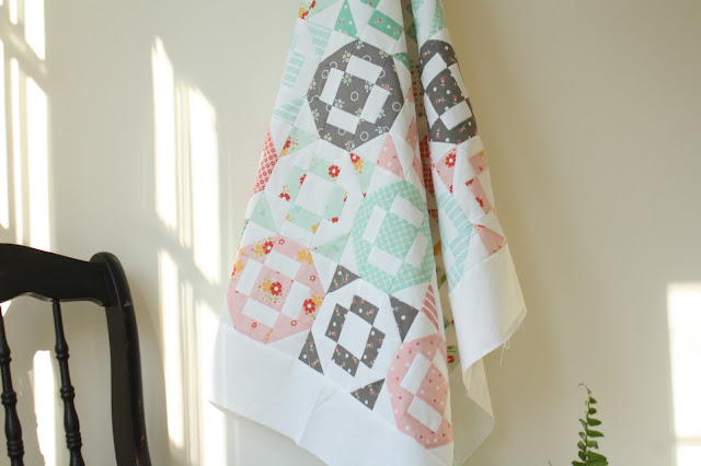 I used my favorite print in the collection to add diamonds in the sashing in place of cornerstones. Just something to anchor it all together. I really enjoyed working with these fabrics and I think the quilt turned out pretty much how I wanted it too, happy and bright! Like flowers and sunshine!